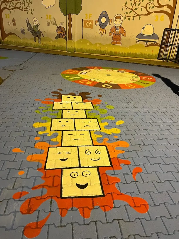 Koridorlarda veya sınıf önlerinde sayı şeritleri, alfabe harfleri veya geometrik şekiller boyanarak, öğrenciler ders aralarında bile pasif öğrenmeye devam edebilirler. Bu yenilikçi yaklaşım, öğrenmeyi günlük yaşamın bir parçası haline getirir.